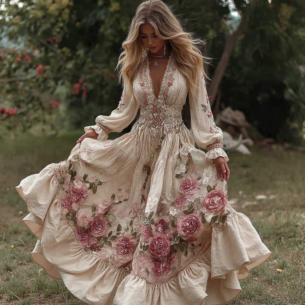 Women's Vintage Roses Embroidery Art V-neck Long Sleeves Maxi Dress