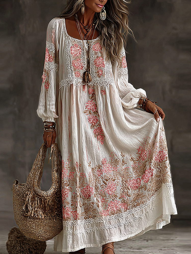 Women's Vintage Vacation Floral Art Flowy Linen Blend Casual Round Neck Long Sleeve Maxi Dress